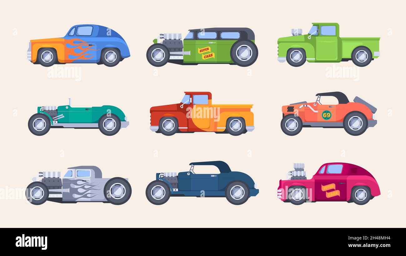 Classic Cars Vintage Tuning Vehicles Colored Cars Old Style Models Fast Movements Garish Vector Illustrations Set Stock Vector Image Art Alamy